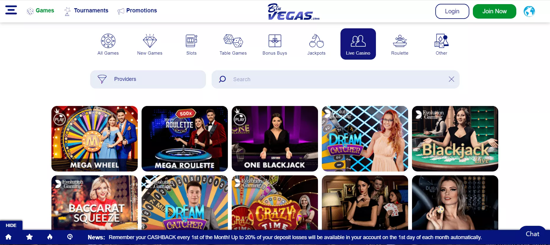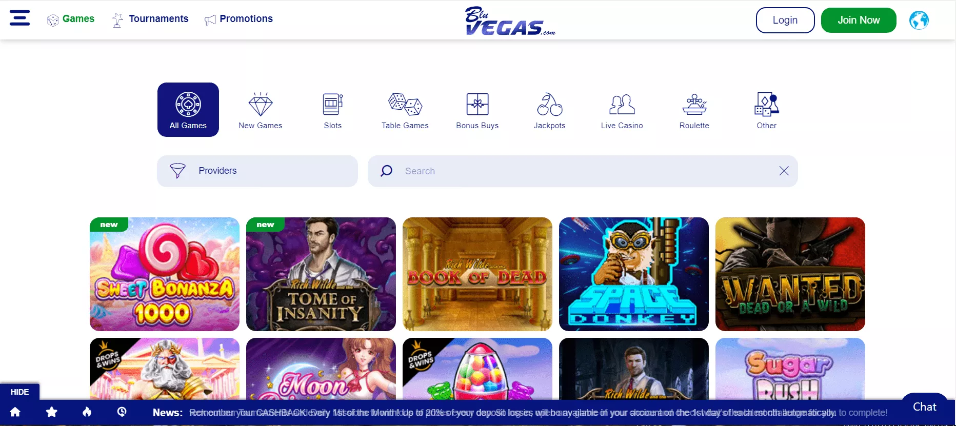 De BluVegas spellen bestaan uit slots, jackpots, tafelspellen en een live casino. Je zoekt eenvoudig tussen de spellen op de site, waarbij er een aparte categorie is met nieuwe software en met overige software. De spellen worden geleverd door onder meer Betsoft, Evolution Gaming en Relax Gaming. Probeer BluVegas software eerst gratis uit, zodat je de regels van het spel kent en geen nodeloze verliezen maakt. Gelukkig is dat hier, na het aanmaken van een account, eenvoudig mogelijk.